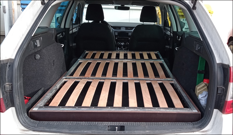 2/ Skládací konstrukce postele je tvořena kombinaci hliníku a dřeva. Jedná se o pevnou konstrukci s nosností 175kg, což bohatě snese zatížení dvou dospělých nocležníků. Ve složeném stavu měří 970x705x80mm a vejde se tak s přehledem do zavazadlového prostoru na předem vložený sokl.